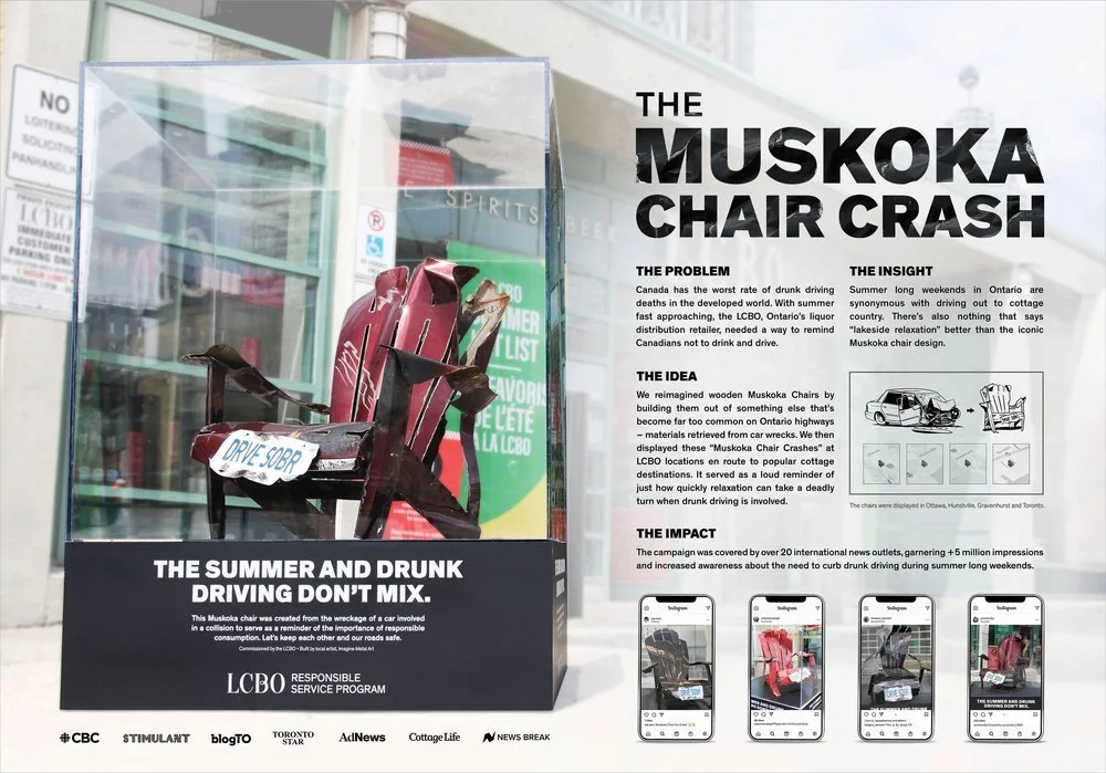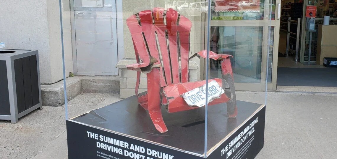 In Canada, few things are more synonymous with long weekends than driving up to a cottage and relaxing in a Muskoka Chair. Working with local artist Trevor McIntyre of Imagine Metal Art, we recreated unique Muskoka Chairs using materials from car wrecks, serving as a reminder not to drink and drive. During the May long weekend, four chairs were installed in key, high-traffic markets – Toronto, Ottawa, Gravenhurst, and Huntsville.