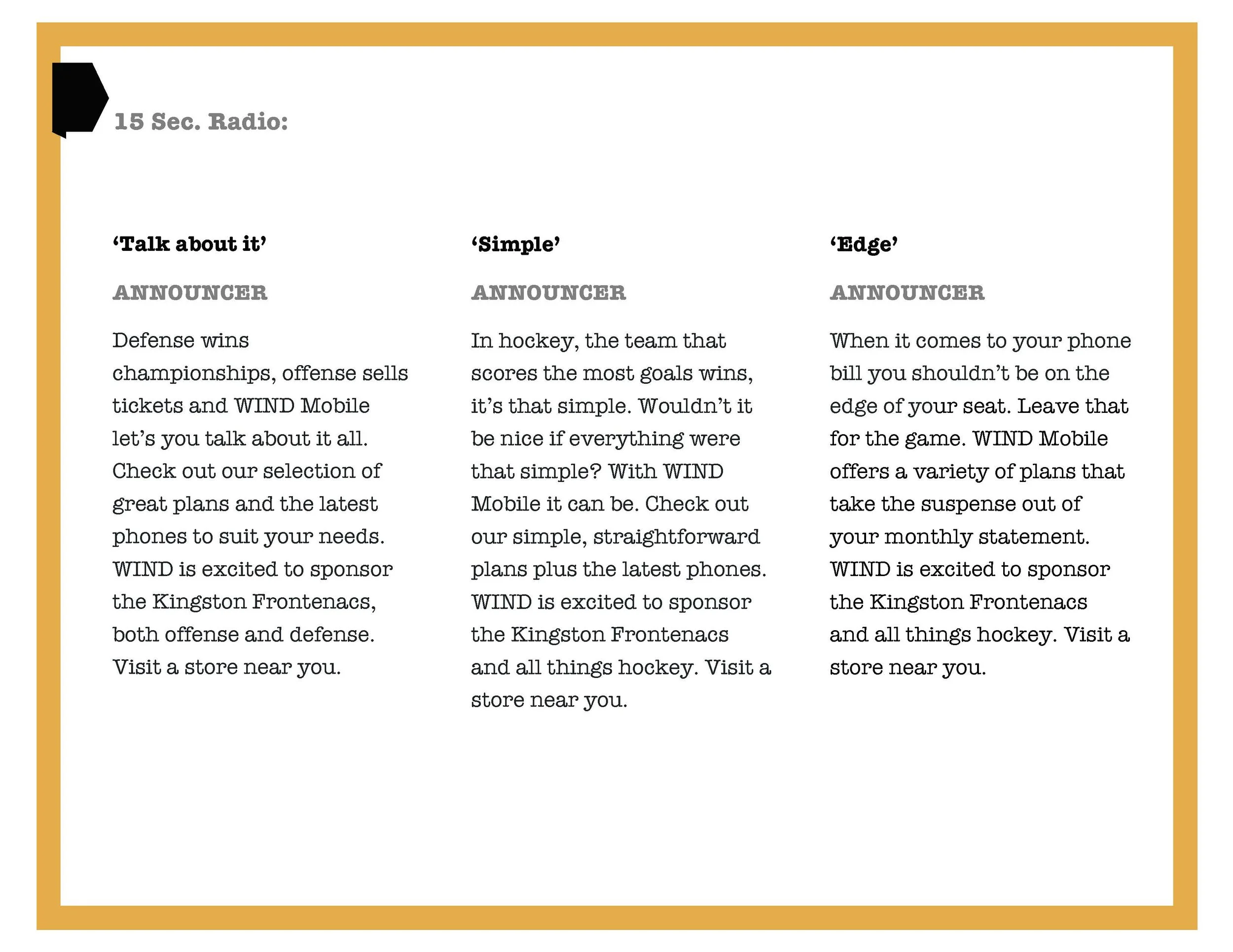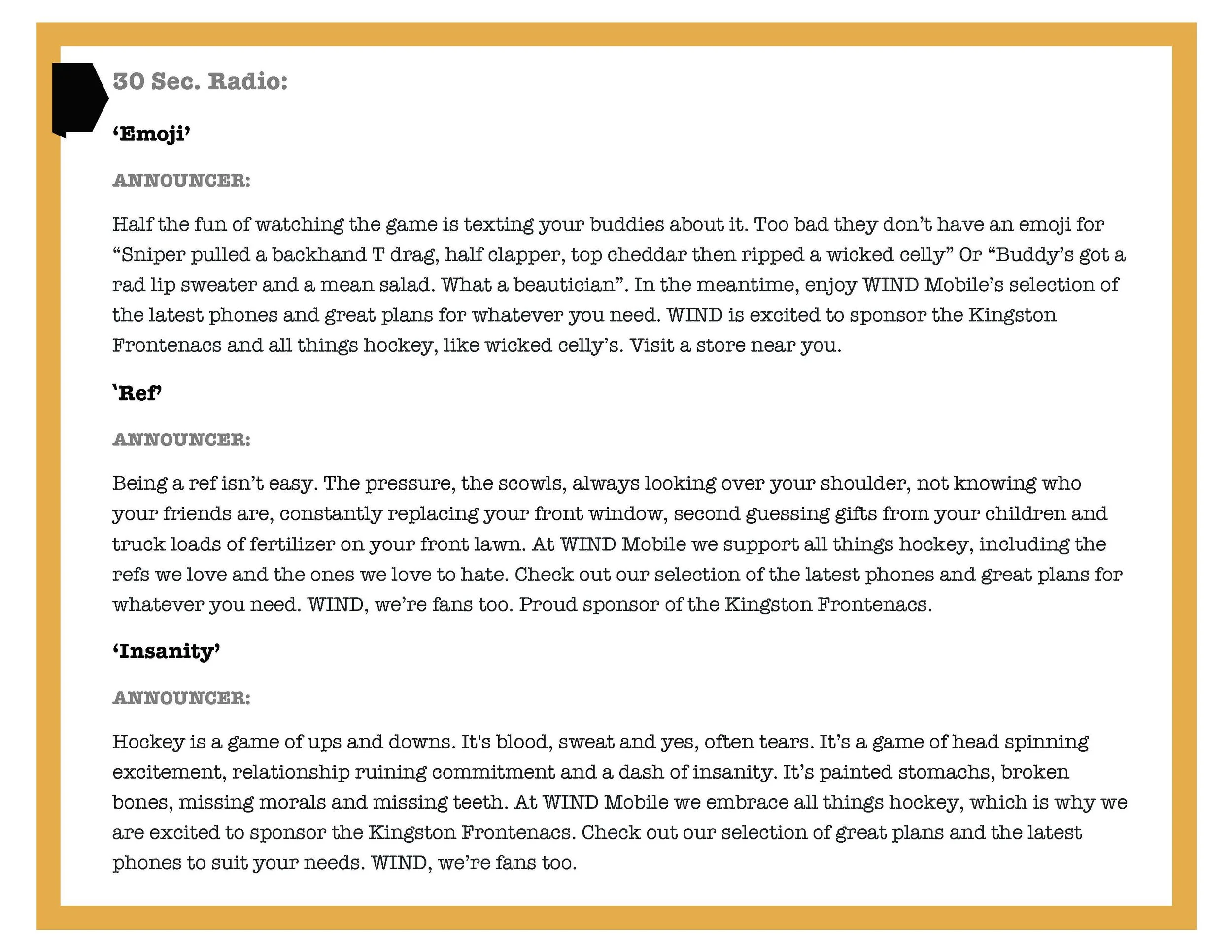 Wind Mobile wanted to create 3 X :15 and 3 X :30 second radio spots for specific teams in the OHL. The spots were read live on the air by the broadcasting team throughout the game.